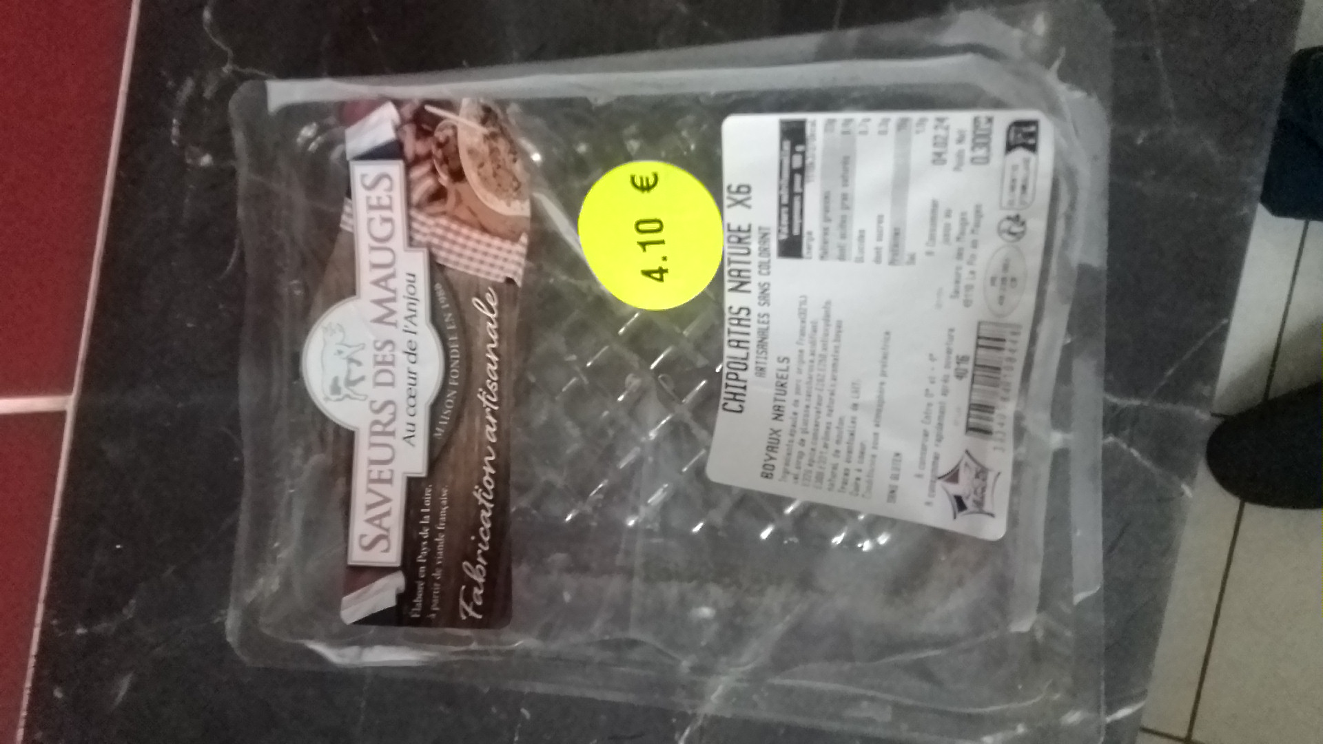 Achat de 4 saucisses aux herbes..déjà a la cuisson réduction de la matière et après ...bah immengeable car beaucoup beaucoup trop salé..